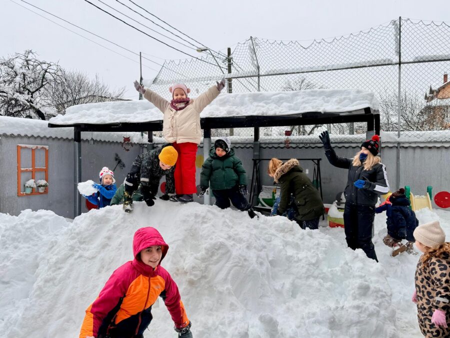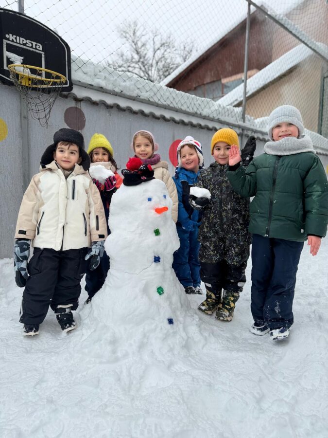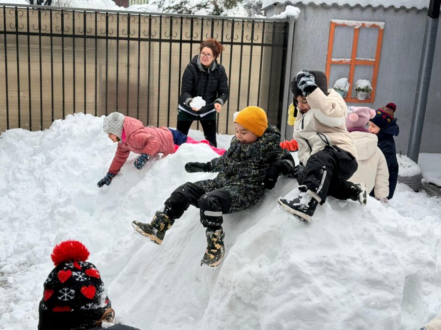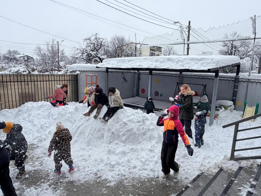 Toți copiii de la Grădinițele „Arc-en-Ciel” sunt fericiți că a nins din nou – și pentru că se pot bucura de troienele de zăpadă!