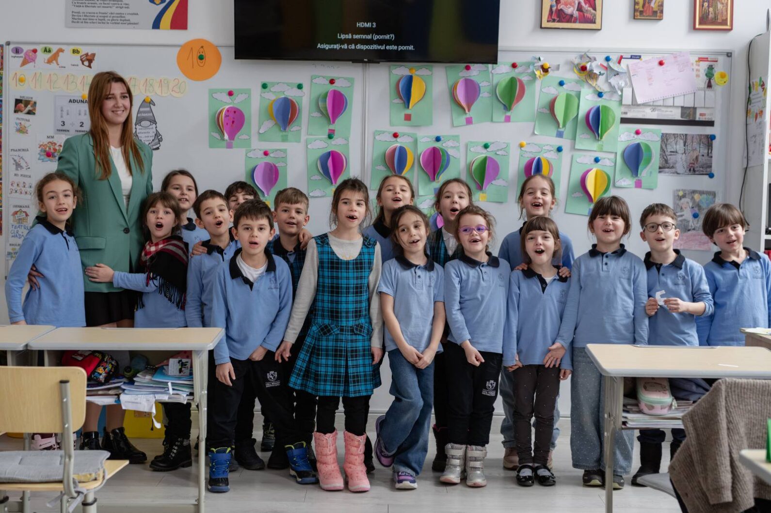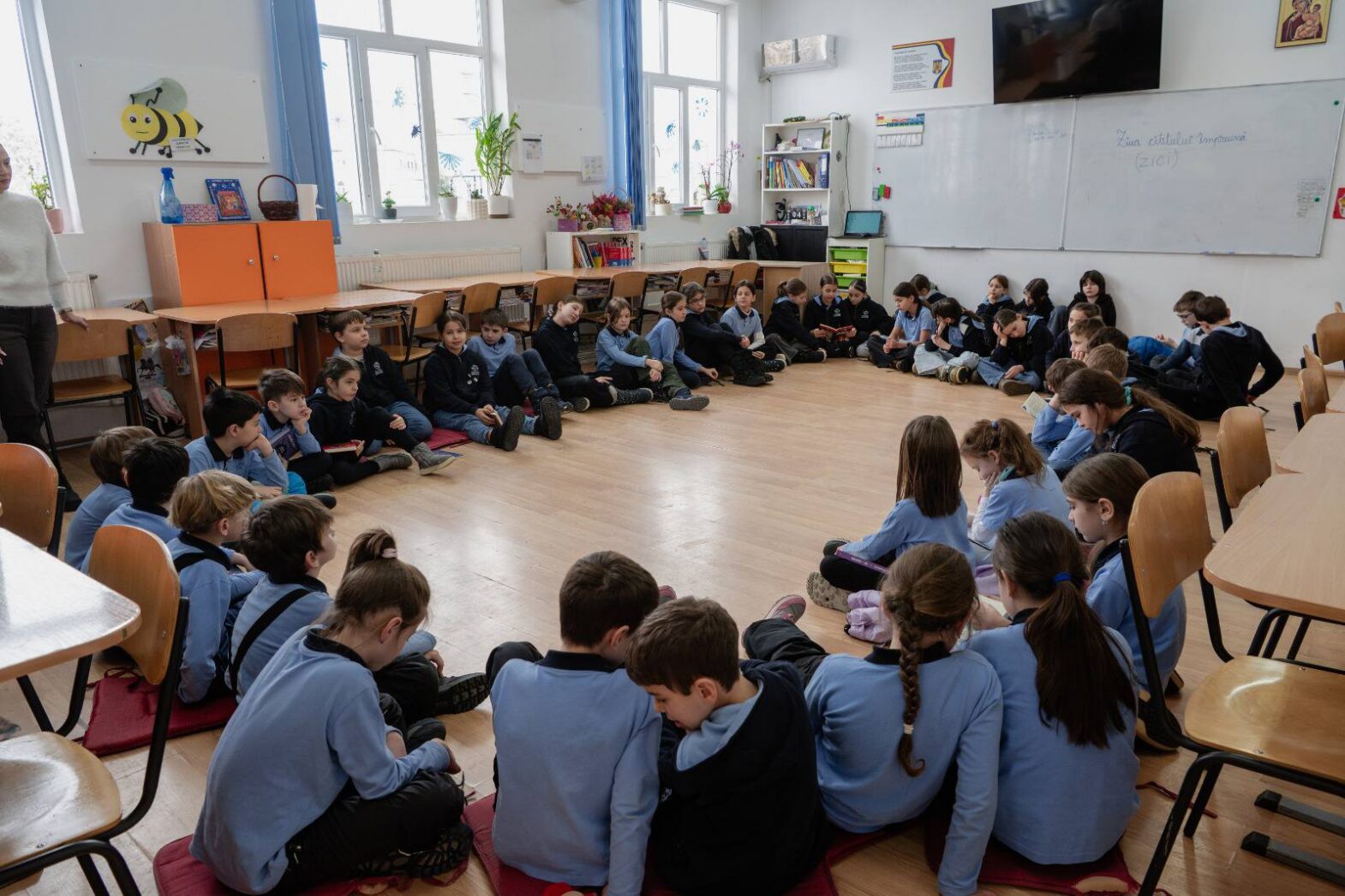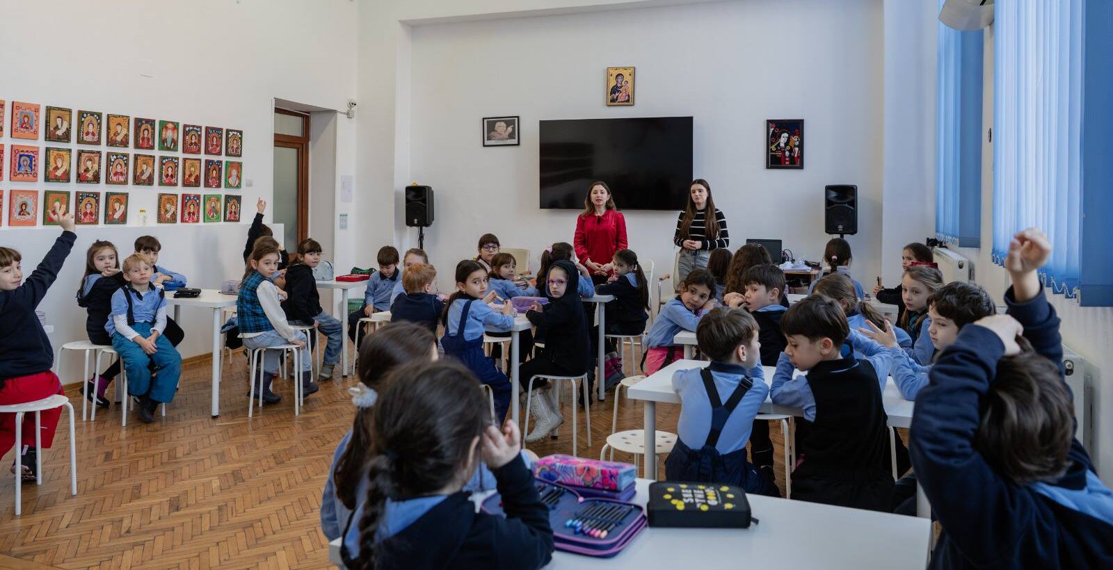 Aici, în prima fotografie, o puteți vedea pe Larisa Popescu, clasa a XII-a, predându-i surorii ei din clasa a III-a, Antonia, și colegilor ei. Stau față în față, ca un profesor adevărat și un elev, dovedind că trecerea timpului se poate măsură și prin situarea față de...