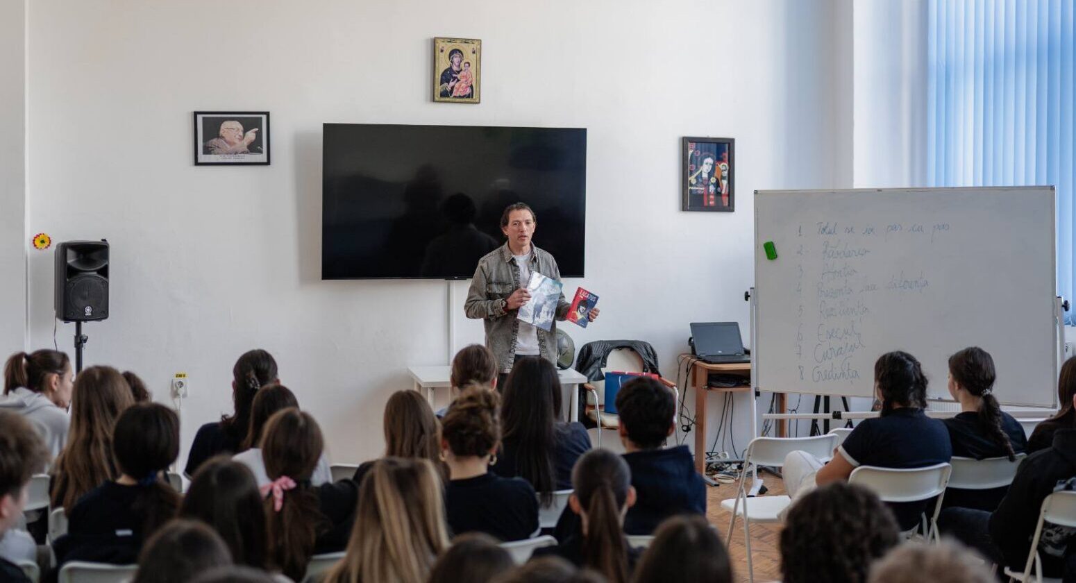 Domnul George Ogăraru a avut bunăvoința să își facă timp în program pentru noi, și ne-am bucurat, fiindcă de câte ori vine are un impact foarte bun asupra liceenilor noștri.