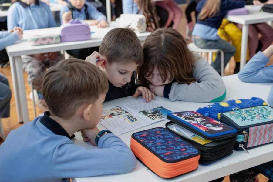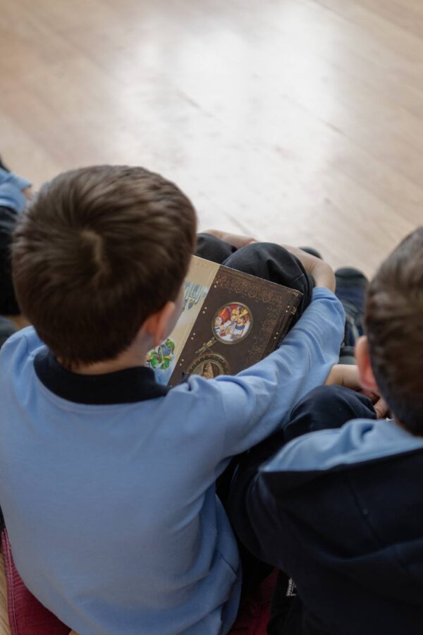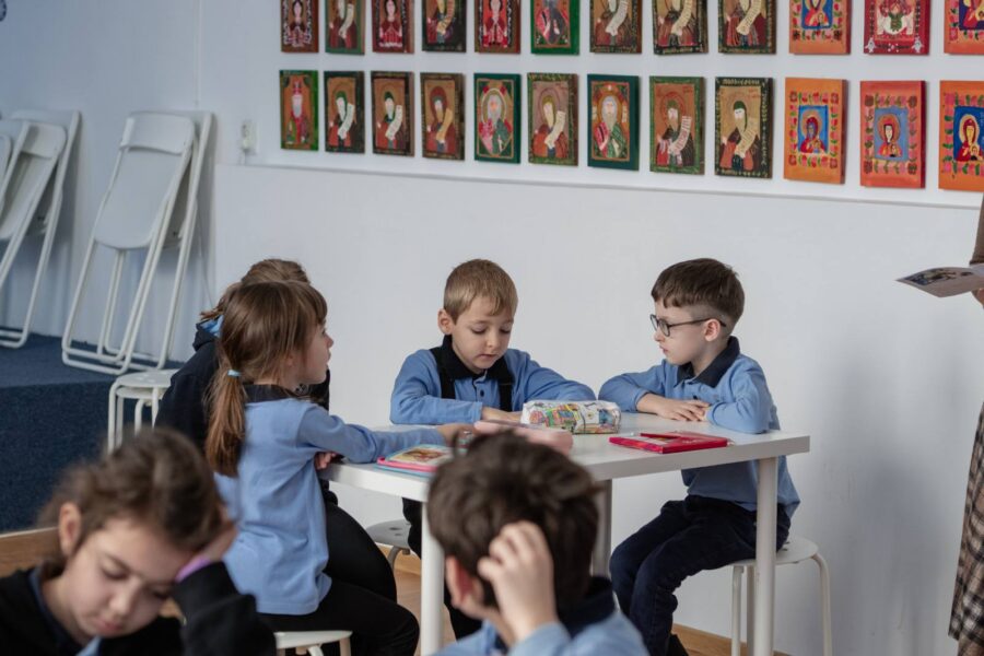 • Sub o plasmă închisă, în care se reflectă șiruri de icoane pictate de ei, trei copii citesc. Și mai mulți, ascultă. 3 feb. 2026
